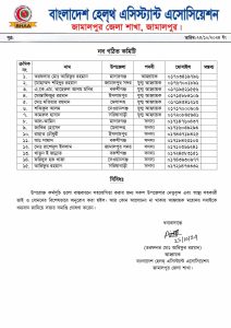 সবার সিদ্ধান্তে ৩ মাসের জন্য বাংলাদেশ হেলথ্ এসিস্ট্যান্ট এসোসিয়েশন জামালপুর জেলা শাখার আহবায়ক কমিটির তরফদার মো: আরিফুর রহমানকে আহবায়ক ও ,মোহাম্মদ শহিদুর রহমানকে যুগ্ম আহবায়ক করে ১৫ সদস্য বিশিষ্ট কমিটি গঠন করা হয়।  অন্যান্যরা হলেন যুগ্ম আহবায়ক এ.কে.এম তাহেরুল আলম মনির,  মোস্তাফিজুর রহমান, মো: মতিউর রহমান, শফিকুল ইসলাম, কামরুল হাসান, সদস্য আল আমিন, জাকির হোসেন, রাহাত চৌধুরী, আ: সামাদ, মো: রাশেদুল ইসলাম, খাতুন ই জান্নাত, ফরিদুল হক খাজা, আরিফুর রহমান।