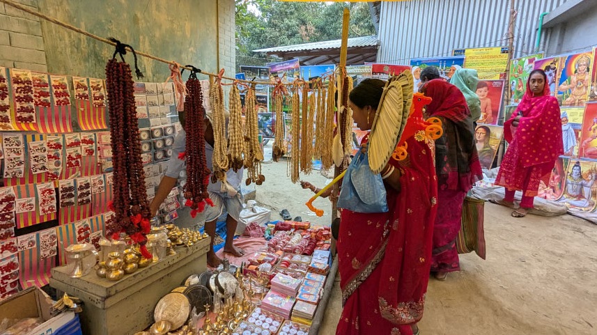 গ্রামের একটি বাড়ির উঠোনের সামনে দেখা গেল আলতা, চুড়ি, লেইস ফিতা, সিঁদুর কৌটা, টিপসহ মেয়েদের নানা সাজগোজের পণ্যের পসরা সাজিয়ে বসে আছেন কয়েকজন বিক্রেতা। বিক্রেতাদের সামনে ছড়িয়ে ছিটিয়ে রয়েছে রুদ্রাক্ষ মালা, পূজার ঘণ্টা, সিঁদুর দানি, কাঁসার বাসনকোসনসহ নানা পণ্য। এখানে আগত ক্রেতাদের মধ্যে সবাই নানা বয়সী নারী।